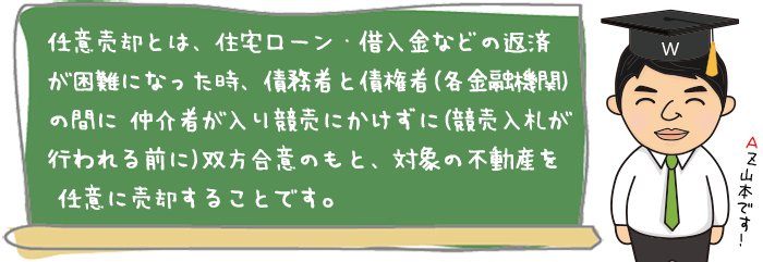何らかの事情で住宅ローンの返済が困難になった場合、銀行等金融機関は、抵当権に従って所有者の不動産を競売にかけ、現金にしようとします。競売ですと、いくらで落札されるかは開札日までわかりませんが、市場価格より2~3割低い価格になることも多々あります。そこで不動産業者などの仲介者が入り不動産所有者と各債権者の合意のもと、双方が納得する価格を設定すれば、不動産を市場で売却することができます。